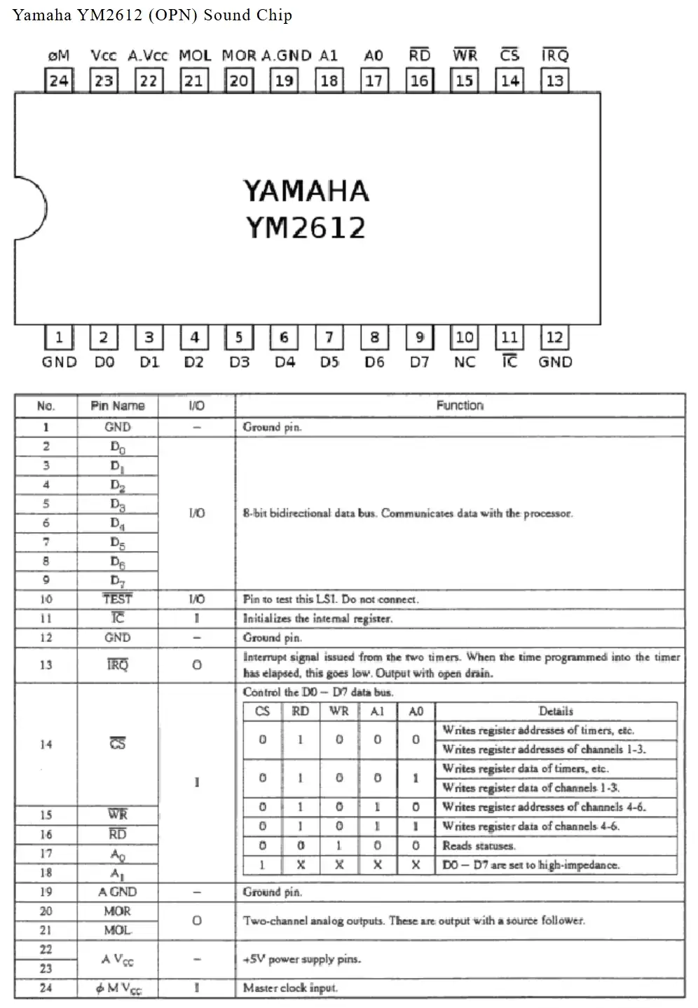 The Yamaha YM2612 is a six-channel FM synthesis sound chip introduced in 1988, part of the OPN family derived from the YM2203. It implements a four-operator FM synthesis engine with 8 different operator algorithms, each defining how modulators and carriers are interconnected to generate complex harmonic spectra. Unlike earlier chips in the family, the YM2612 integrates both the synthesis core and a built-in 9-bit DAC (digital-to-analog converter), which simplified design for system integrators such as Sega in the Mega Drive/Genesis. The chip operates with a master clock typically at 7.67 MHz (in PAL/NTSC consoles) and divides this to produce the required timing for envelope generation, operator updates, and frequency modulation.