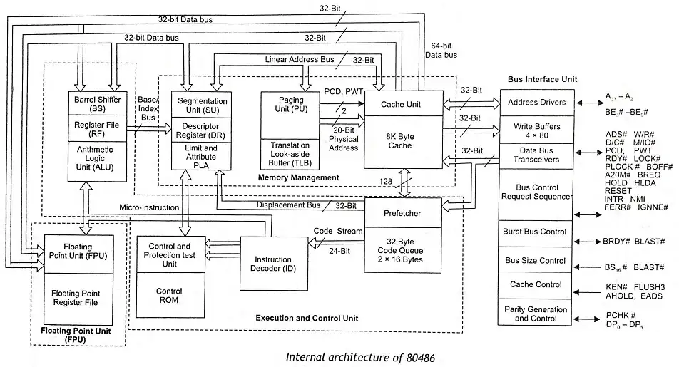 Memory management in the 80486 remained based on the 80386 model, with full support for segmentation and paging. It implemented a 32-bit address bus, allowing access to 4 GB of physical memory, and a 32-bit data bus for efficient transfer of large operands. The paging unit supported 4 KB pages with full page-level protection, as well as demand-paged virtual memory when used with appropriate operating systems like Windows NT or Unix System V. Combined with the larger and faster cache, the 80486 could sustain much higher throughput in multitasking environments, making it the processor that bridged the transition from 16-bit DOS-centric computing to true 32-bit protected-mode operating systems.