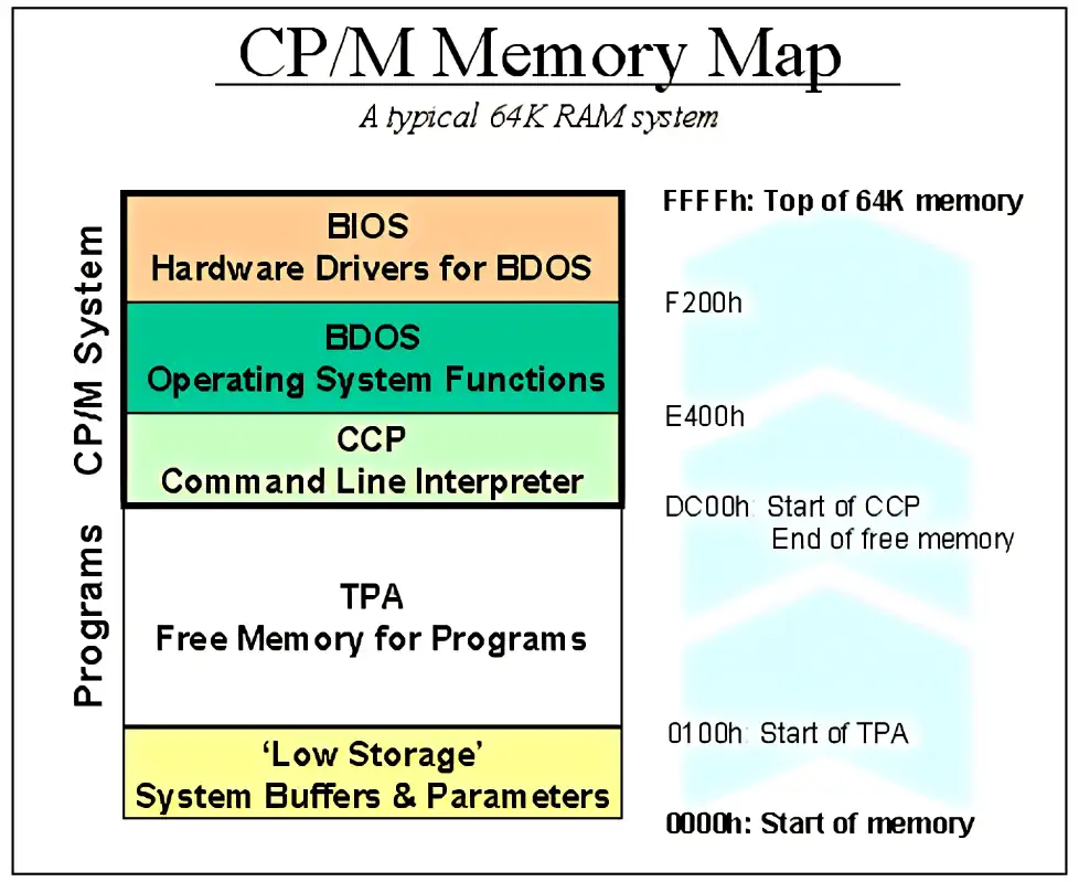 Memory management in CP/M was constrained by the 8080 and Z80’s 64 KB address space, so the operating system was designed to occupy only the top portion of memory. The BDOS and CCP were typically loaded into high memory, leaving a contiguous block of low memory available for transient programs (user applications). Applications were written to expect a fixed TPA (Transient Program Area), with the starting address varying slightly depending on how much memory was available after BIOS/BDOS were loaded. This simple scheme avoided the need for virtual memory or sophisticated protection mechanisms, but it limited multitasking: CP/M was strictly a single-tasking environment. Program overlays and clever memory swapping techniques were sometimes used by developers to fit larger applications into the available TPA, especially for compilers and database software.