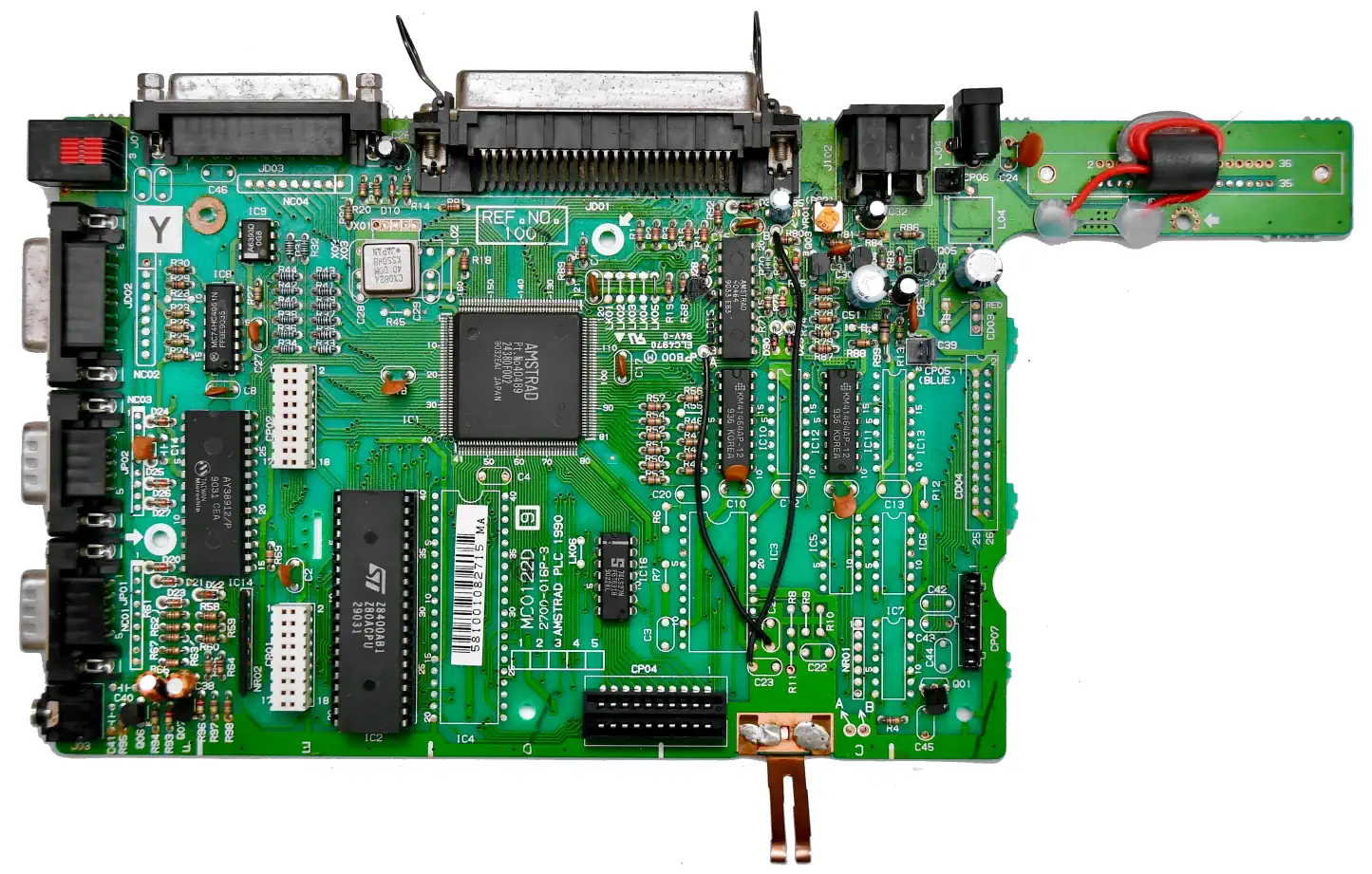 “CPC ASIC” refers to two different integrations in the CPC line. The 1988 cost-down CPC464/6128 used a 100-pin pre-ASIC (Amstrad 40226) that consolidated the Gate-Array, the RAM-management PAL and a 6845-class CRTC into one device; it adds no new graphics or audio features versus earlier CPCs and is commonly labeled CRTC type 4 in scene documentation. The later 1990 CPC+/GX4000 machines used a distinct ASIC (AMS40489) that both replaces earlier custom logic and adds new display/audio capabilities; CPCWiki describes it as the “second heart” of the Plus range.