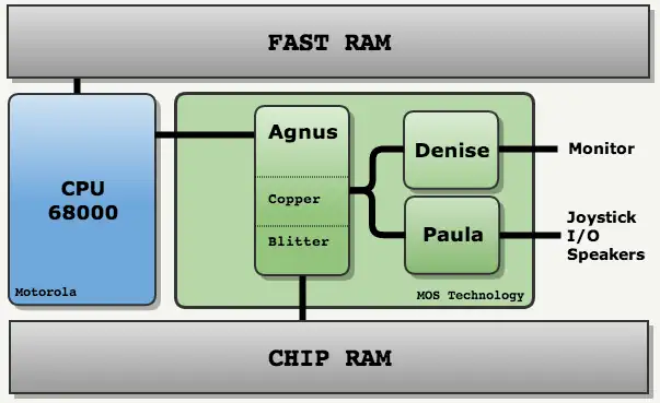 The Amiga architecture is built around Motorola's 68000 processor. The Amiga 500 came standard with 512KByte of RAM, expandable to 9MByte. The RAM was devided into Chip RAM and Fast RAM. The Chip RAM was accessible by the Video and Sound Chip, and the Fast RAM was accessible by the CPU.